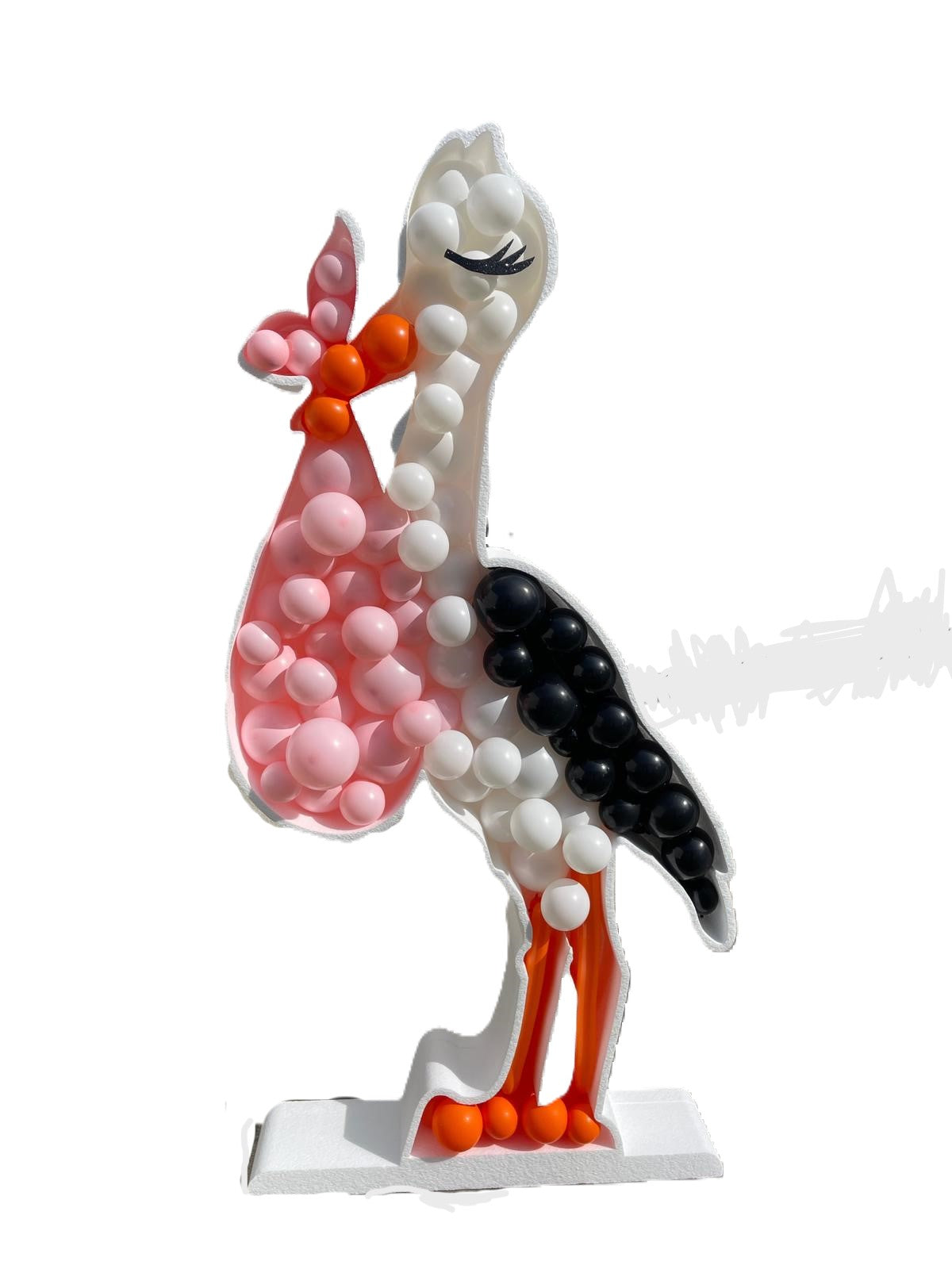 Questo porta palloncini rappresenta una cicogna, realizzato in polistirene densità 30. Viene utilizzato per i baby shower, gender reveal o battesimi.